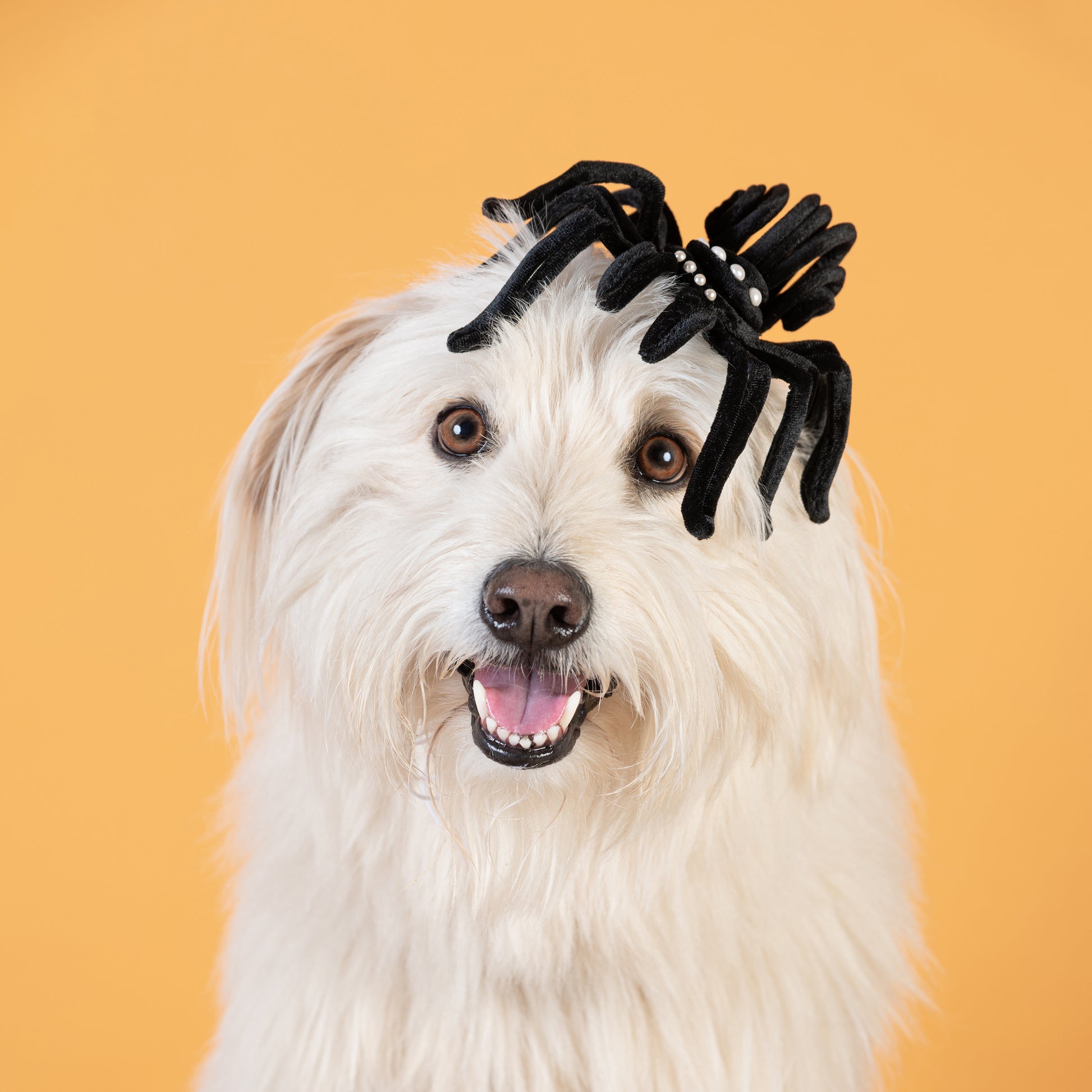 Inspired by Halloween and creepy crawlies, this velvet tarantula headpiece brings a touch of spooky glamour. The name ‘tarantula’ comes from tarantism—an urge to dance uncontrollably—so slip on your (eight) dancing shoes and celebrate the joy, resilience, and spirit of our wonderful rescue dogs!